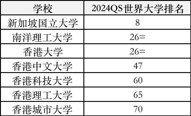 新加坡国立大学位列2024QS世界大学排名第8。香港大学、香港中文大学和香港科技大学是学生申请人数较多且较受欢迎的院校。
