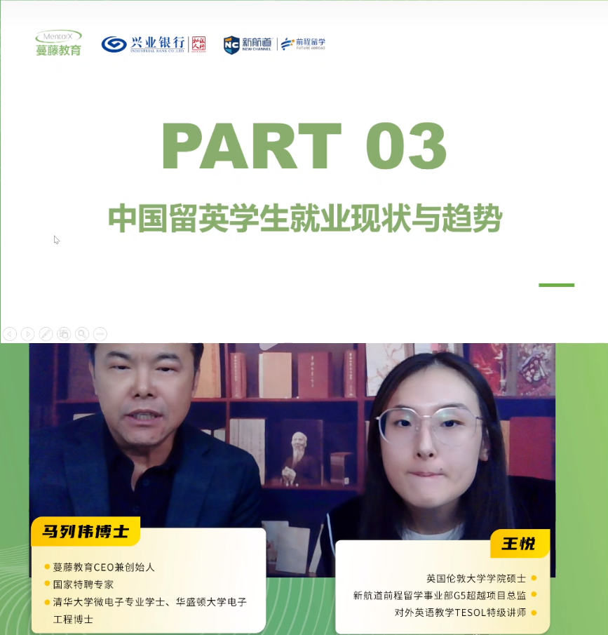 蔓藤教育创始人兼CEO马列伟博士在发布会通过数据阐述目前英国就业形势,以及展望2024年的就业市场,留学生可以提前规划以下新兴机会。