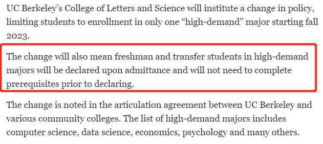 伯克利将限制学生只能注册一个热门(high-demand)专业。对于那些希望转入计算机科学专业的学生,他们将被要求在申请时就被选入该专业,而不再允许他们在入学后再进行转换。