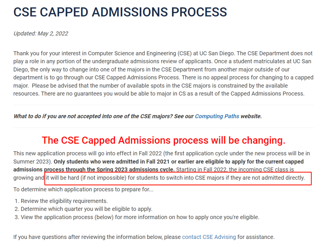 加州大学圣地亚哥分校(UCSD)也发布通知,从2022年秋季开始,如果没有直接被CSE专业录取,学生将很难(几乎不可能)转入CSE专业。