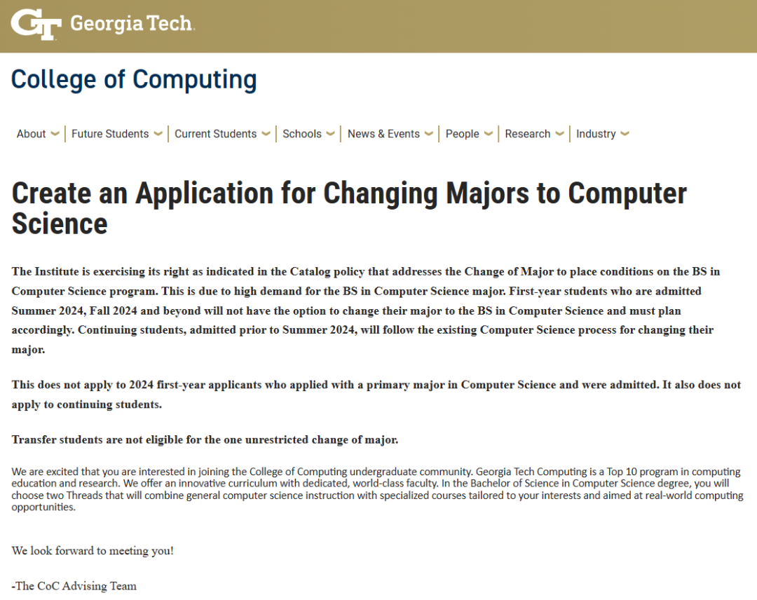 近日,佐治亚理工学院官宣:由于学生对计算机科学学士专业的需求量大,2024年夏季、秋季及以后入学的一年级新生将不能转入计算机科学理学士专业。