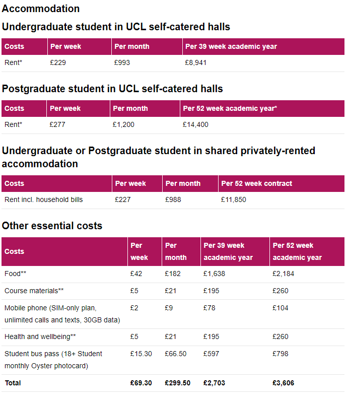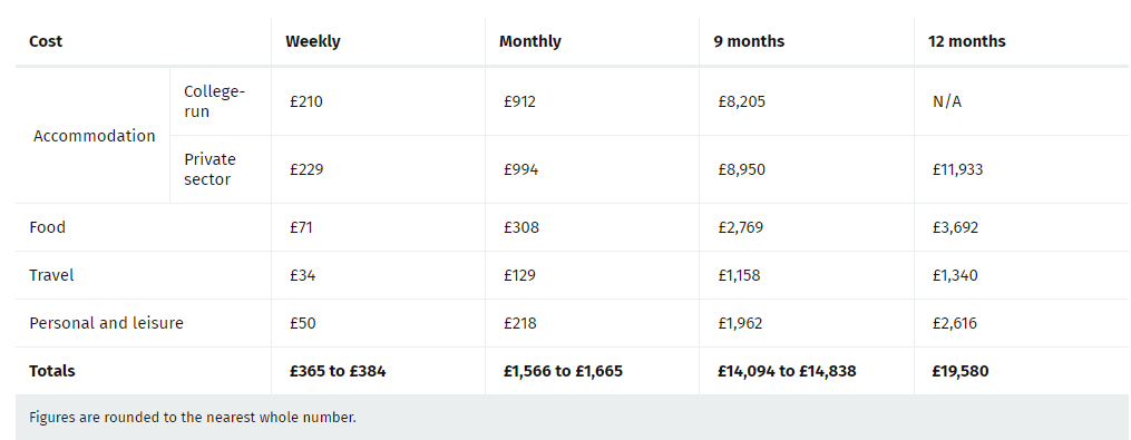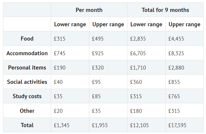 生活费用包括食物、住宿、社交活动和回国旅行,以及有可能的英国或欧洲旅行预算。