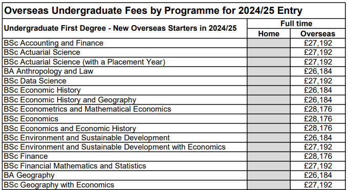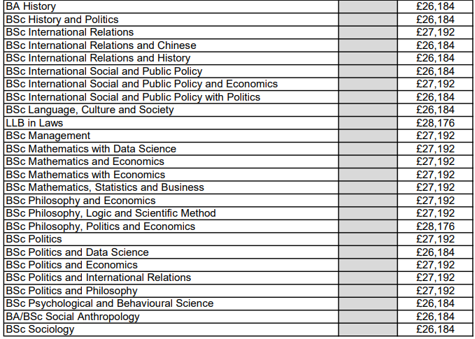 2024/25学年,LSE学费在26,184-28,176镑,各专业差距不大,比2023/24学年学费上涨约6%左右。