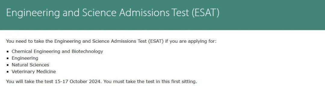 申请剑桥大学化学工程与生物技术专业、工程专业、自然科学专业和兽医专业的同学,需要参加ESAT入学笔试。申请人必须参加阶段的ESAT考试,阶段ESAT笔试举行的时间为2024年10月15日到10月17日。