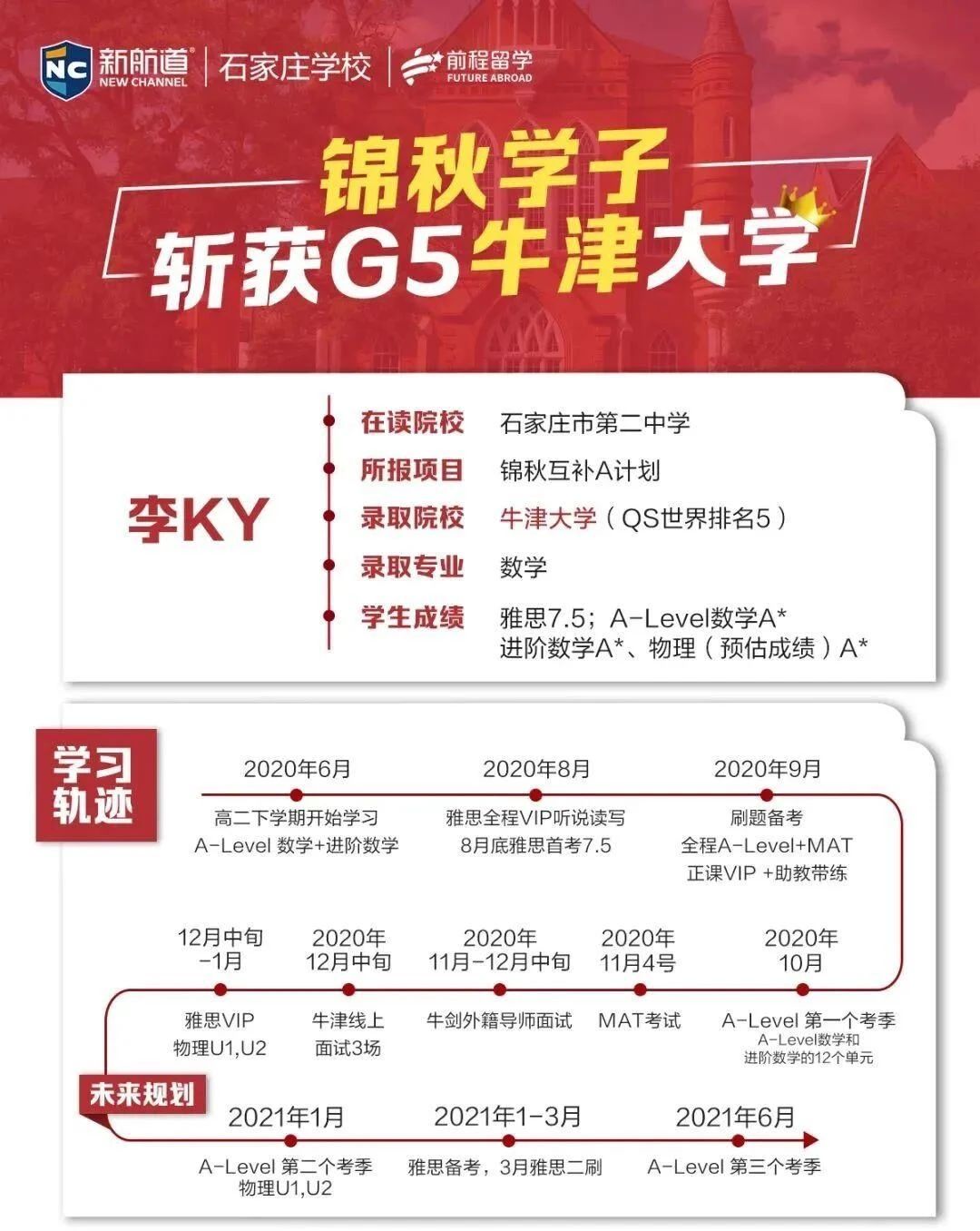 全球学府之一牛津大学,每年录取的中国学生屈指可数。其中就有新航道石家庄学校锦秋学院的20级学员李KY同学。
