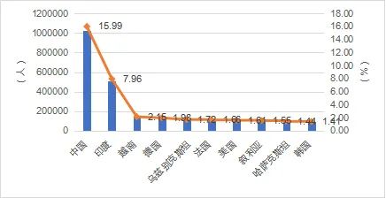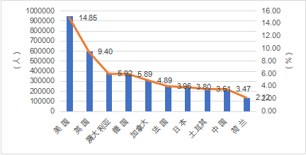 美国、中国、德国、法国不仅是前十大留学目的国,还是前十大留学来源国。其中,中国是国际生的来源国,全球15.99%的国际学生都来源于此。