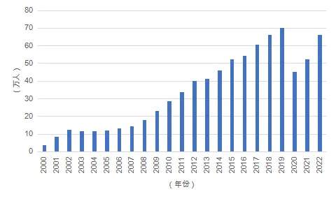 2000-2022年中国当年出国留学人员数量变化