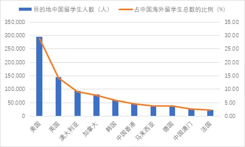 根据UNESCO数据显示,截止至2021年,最多中国学生选择的前五个留学目的地,占中国海外留学生总数的65.96%,这五个国家分别为: