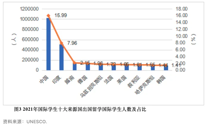 根据UNESCO数据,2021年中国在海外高等教育机构留学的学生共102.1万人,数量居全球首位。