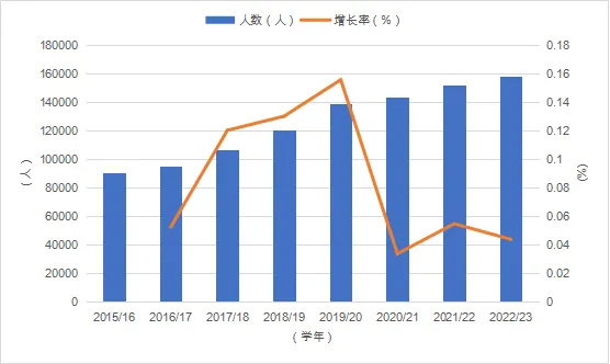 过去几年的数据显示,2015/16-2019/20学年,在英接受高等教育的中国留学生总人数涨幅超过50%,增长率持续维持在中高水平,单年增幅达到 15.57%。这表明,中国学生对于优质的海外高等教育有着强烈的需求,并且随着中国经济社会的蓬勃发展,越来越多的家庭有了出国留学的能力。英国作为留学的热门目的地,其声誉不断增强,对中国留学生仍具有持续吸引力。