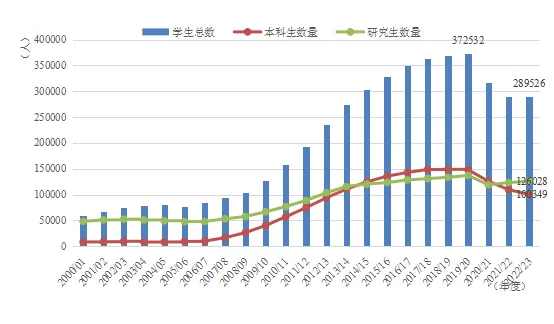 2000/01学年至2022/23学年中国在美留学生人数变化
