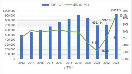 从2000年到2019年,尤其是在2008年北京奥运会后,中国的留学人数经历了快速增长,与中国参与全球化的趋势一致。尽管2022年的留学人数尚未恢复至2019年的水平,但从2023年美国、英国等国对中国学生签发的留学签证数量来看,中国学生的海外留学需求仍然旺盛,出国留学的趋势正在稳步复苏。