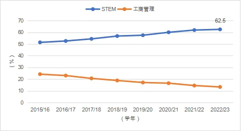 2015/16~2022/23学年中国在美留学生就读STEM专业和商科的占比