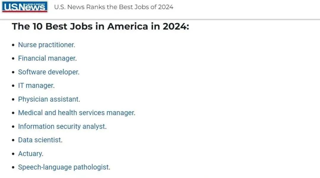 全球排名和消费者咨询权威机构《美国新闻与世界报告》(U.S. News & World Report)发布了2024年职业排名。这一排名提供了对17个类别的职业的概览,涵盖了工程和商业等领域。该排名考虑了一份工作非常重要的方面,包括成长潜力、工作与生活的平衡、工作安全、就业率和薪水。