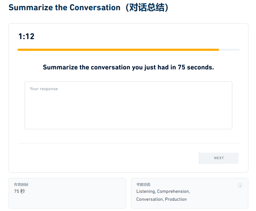 Summarize the Conversation(听力对答)题目出现在Listen and Respond题目之后,要求考生就Listen and Respond中的内容在75秒内键入大意总结。每次考试有2道这样的题目。考察的是听说读写中的写作水平。