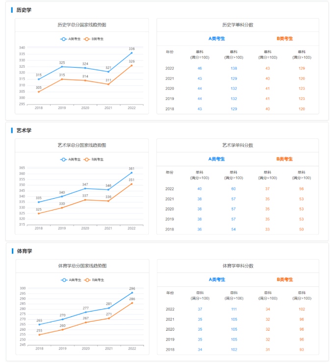 再看各个学科专业的折线图,无一例外都呈上涨的趋势,竞争这么激烈的情况下,分数下降的可能性不大,估计会继续走高。所以你给自己定的目标应该超过去年目标院校专业录取最低线20分左右,才算比较稳。