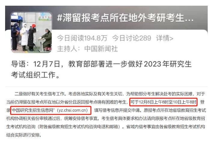 异地借考指的是异地考生因为特殊情况无法赶往考点所在地,需要借用现在所在地考点参加考试。对近几年的考研人来说,“特殊情况”普遍指因疫情影响无法及时返回考点。