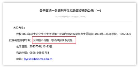 海南医学院研究生招生信息网发布一则公示,某调剂拟录取考生因体检不合格,学校取消其拟录取资格。