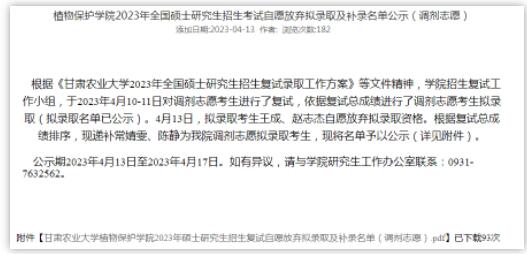 甘肃农业大学植物保护学院公布了2023年全国硕士研究生招生考试自愿放弃拟录取及补录名单,补录4人。