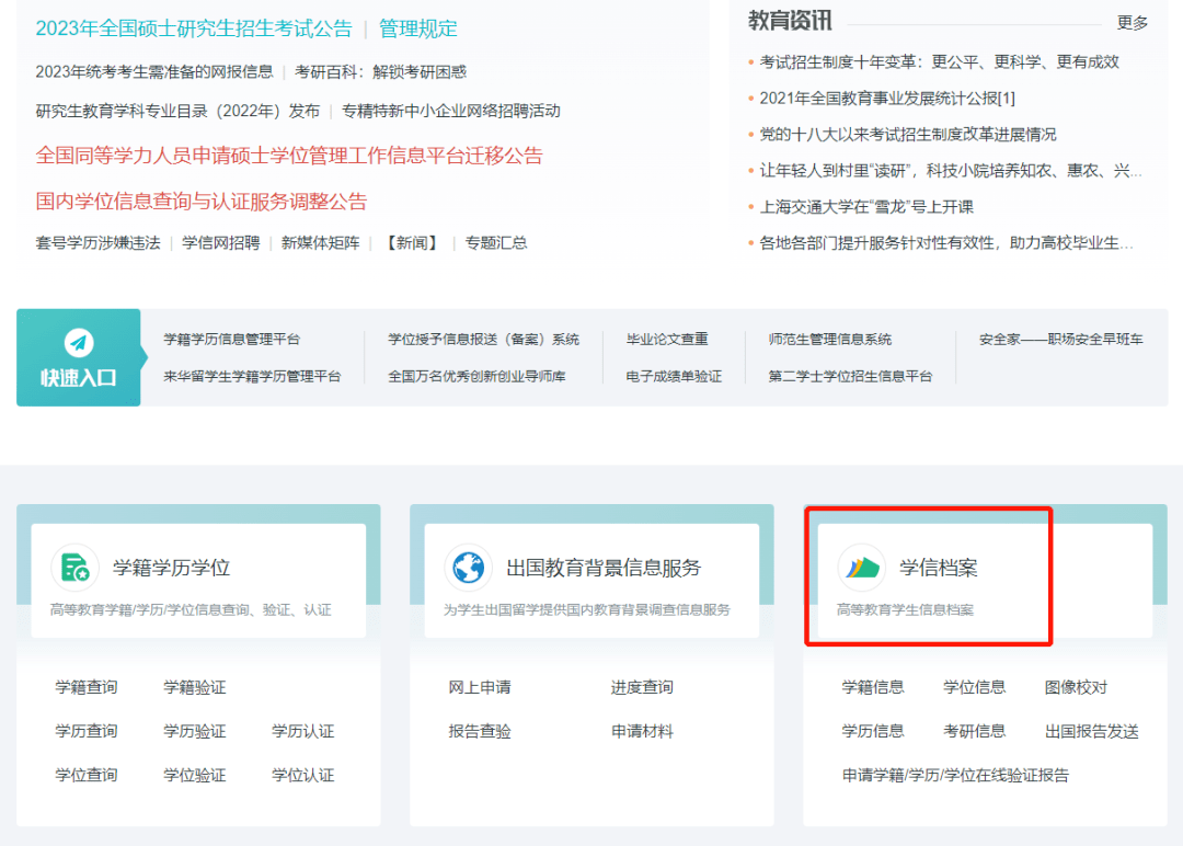 学信网开通了学籍学历信息管理平台、中国研究生招生信息网、内地高校面向港澳台招生信息网等平台;以及历查询系统、硕士研究生网上报名和录取检查系统、硕士研究生招生调剂服务系统等20多个信息系统。