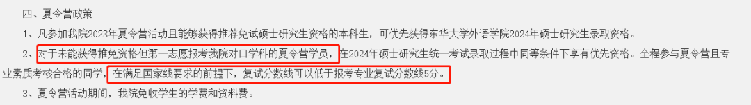 重庆大学外国语学院夏令营活动中的优惠政策就提到:志愿报考我院,达到我院2022年各专业复试基本分数线的,无需参加面试,以在营期间综合表现和考核成绩作为录取依据。