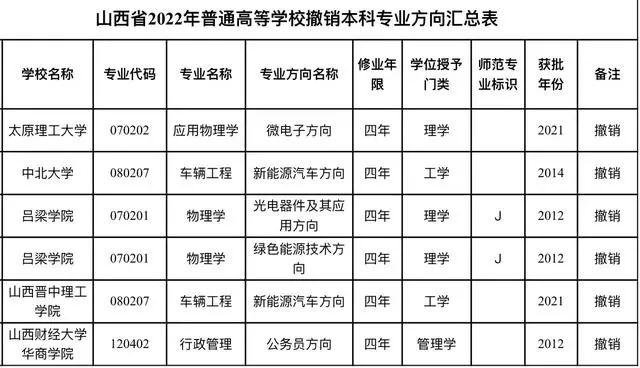 山西省教育厅关于公布2022年本科专业方向设置结果的通知,经审核,同意太原理工大学等5所高校撤销6个专业方向: