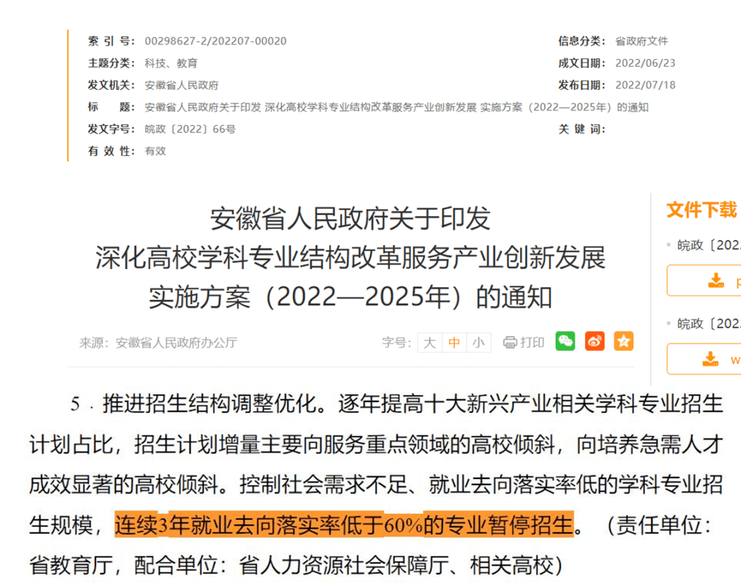 发布通知提出,控制社会需求不足、就业去向落实率低的学科专业招生规模,连续3年就业去向落实率低于60%的专业暂停招生。