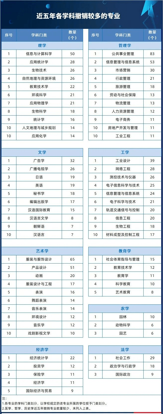 根据相关统计,近六年来共有2495个本科专业被撤销,从会计学到公共事业管理,再到信息管理与信息系统专业,许多过去管理学的热门专业也被撤销了。