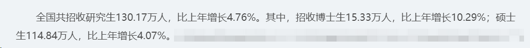 ⚪全国共招收研究生130.17万人,比上年增长4.76%。其中,招收博士生15.33万人,比上年增长10.29%;硕士生114.84万人,比上年增长4.07%。