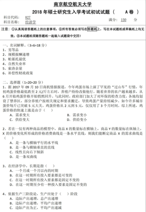 下面一起看一下2018年南京航空航天大学827经济学专业考研真题。
