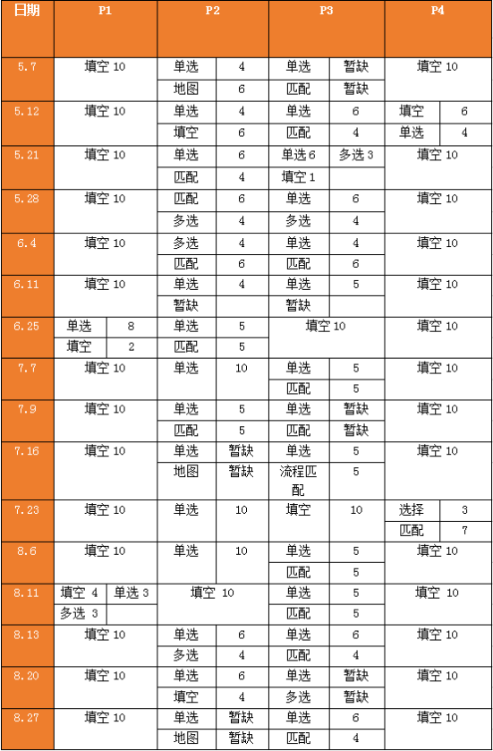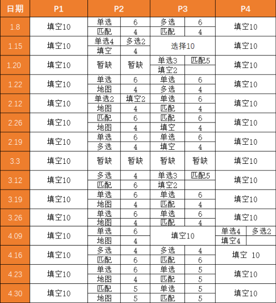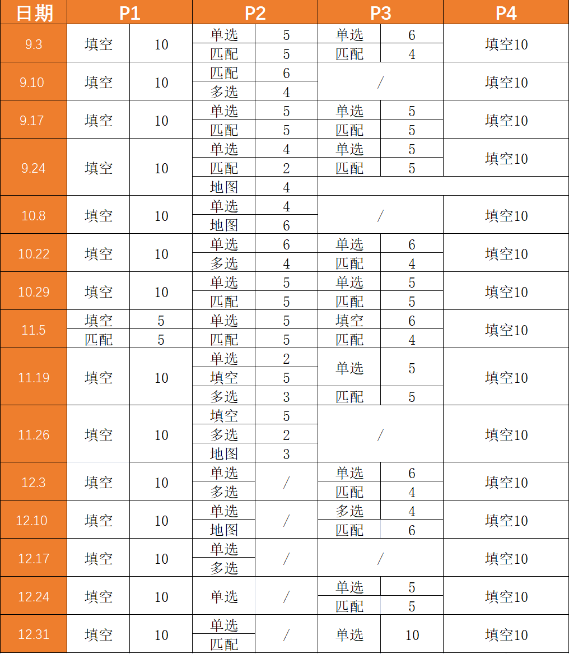 从上表总体来说,P1保留了填空题的传统, P4虽然偶有场次会在题型上稍有多元变化但依然是填空题的主战场。P2以选择题和匹配题为主,同时地图题的考察基本上是一半的概率。P3虽然偶有部分填空乱入,但基本以配对题为主,再搭配单选或多选。