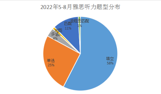 从上表可知,2022年5-8月雅思听力填空题和选择题(包含单选、匹配、多选、地图和流程图匹配题)的占分别为58%和42%,较之前相比,填空题的比例略有增高,但是符合整体出题的大趋势。选择题分布中,单选占比最高,其次是匹配和多选,地图题和流程匹配题出题频率较低。