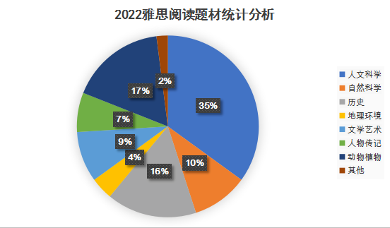2022雅思阅读题材中,所占比例最大的为人文科学研究,占比高达35%;其次是动植物类与历史发展,分别占比为17%和16%;自然科学与文学艺术,占据的份额也比较多,达到了10%与9%;比重最少依然为地理环境类,为4%。在人文科学方面,雅思偏重于考察心理学方面的内容,在此类文章中,新单词及术语出现的频率较高,对同学们的词汇量及阅读水平提出了更高的要求。语言学家及儿童心理学家皮亚杰是今年人物类考察热点,大家可以参考九分达人相关内容,积累语言学相关内容及词汇。企业与经济管理也常考话题,除了完成剑桥上与之相关的文章,大家在阅读报纸期刊杂志时,可以作为重要内容进行分析。
