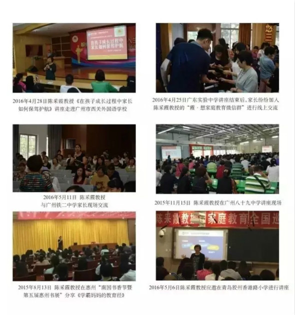截止2016年9月2日,陈采霞教授已在北京、上海、广州、西安等开展家庭教育全国巡回讲座80场,数万家庭受益。