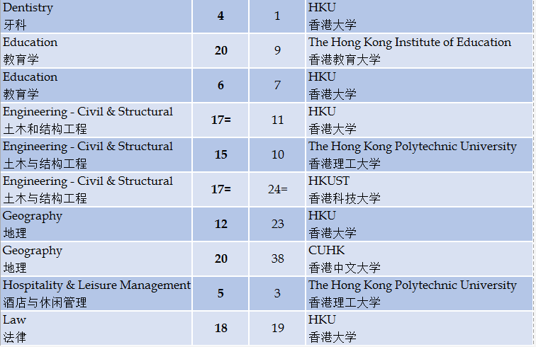 香港地区高校也表现不凡,香港大学的牙科排名世界第4,其教育研究学排名从世界第7位上升至第6位,而香港理工大学的酒店及休闲管理学科排名世界第五。