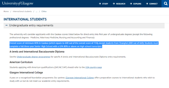 ●高考成绩达到总分的 80%,即 600/750 (上海等地区按当地总分换算);