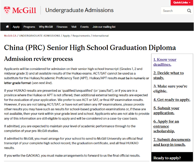 麦吉尔大学要求中国普高申请人必须提供:平时成绩、高中毕业证、会考成绩、高考成绩。学校对高考成绩没有明确要求,一般建议高考成绩达到省一本线以上。