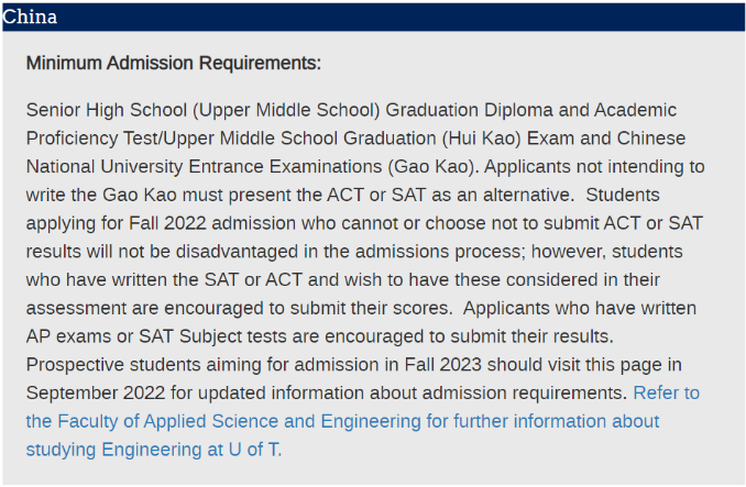 多伦多大学要求中国普高申请人必须提供:会考成绩、高考成绩、高中毕业证明。高考分数需超过所在省份一本线。