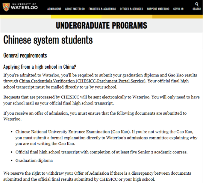滑铁卢大学要求中国普高的申请者提供:高中毕业证、高考成绩、高中毕业成绩单。高考成绩建议在一本线以上。