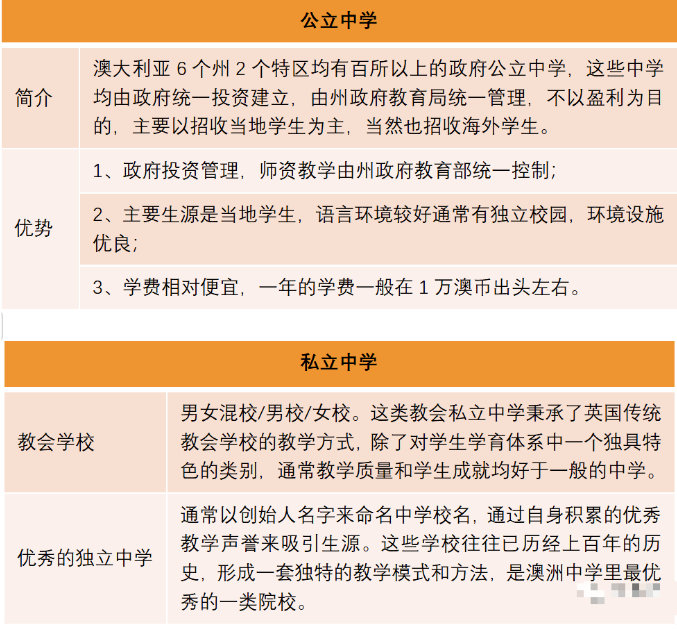澳洲中学承袭了英国的教育制度,主要分为公立中学和私立中学两种,也有男校、女校和混校。