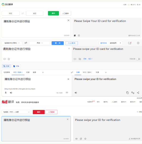 然而我查询了各个翻译网站,发现他们的机器翻译都把“刷身份证”翻译成了“swipe the ID card”……大错特错!!!