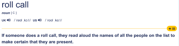 英文释义为: If someone does a roll call, they read aloud the names of all the people on the list to make certain that they are present.