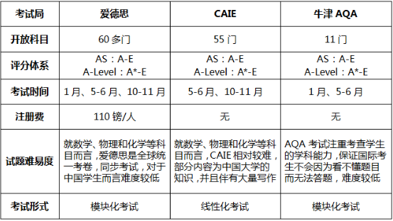 A-Level由英国七大考试局(爱德思、CAIE、AQA、OCR、ICAAE、WJEC和CCEA)组织考试,国内常见的三大考试局分别是爱德思、CAIE(原CIE)和牛津AQA考试局。各考试局的A-Level教材、教学大纲、课程设置和考试不尽相同,但最终的成绩都是同样有效的。