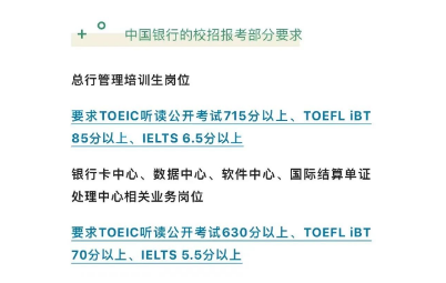 而对于银行的高级岗位来说,没有合格的雅思托福成绩是压根不行的。在2022年最新的招聘公告中可以看出,雅思5.5、托福85已经成为候选人最低的门槛。