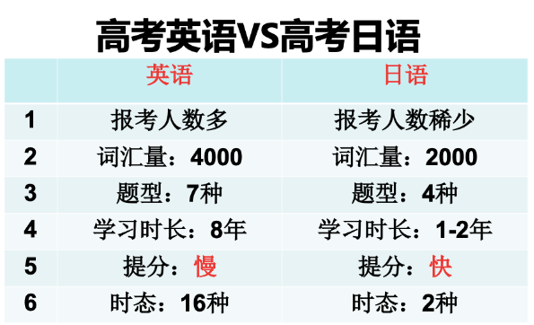 从考纲来看,日语的要求比英语简单,英语需要3500个词汇,日语只需要2000个词汇。如果高考想取得高分,英语需要4500个词汇,日语需要2500个词汇。