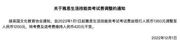 2023年1月1日起雅思生活技能类考试考试费下调100元,以后报考费用就是1250元,不知道明年A/G类考试会不会跟着下调!