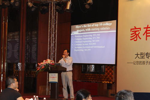 彭铁成博士作为主讲嘉宾应邀出席了活动并做了主题演讲。彭铁成博士是新航道国际教育集团副总裁、美国语言教育专家,曾在美国高校任教数十年,同时也是一个培养出美国高材生的父亲。他以自己一家人以及身边朋友、学生的留学经历为案例,就子女教育和留学规划、英语学习等话题进行现场分析与指导。