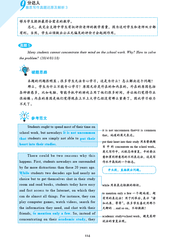 此外,区别于前两本的编写模式,该书精选历年雅思考试出现频率的11大话题,分类揭示出题规律及未来考试方向,并多角度提供破题思路;书中34道全新真题采用“批注”模式,对所给高分范文中会让考官惊艳的“亮点词句”进行突出评析,十分值得考生模仿;不得不提的是,该书收录了27篇5~8分段的学生习作,书中再现雅思写作教师的评改过程,不管哪一阶段的考生都值得拥有!