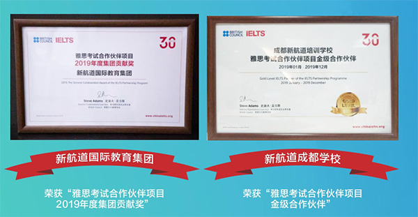 新航道作为专业的出国英语培训机构,尤其在雅思培训上,获得了雅思考试官方的认可“2019年度集团贡献奖”,而新航道成都学校更是获得了雅思考试官方金级合作伙伴的荣誉,所以在新航道学雅思,可以享受专业的雅思培训服务。