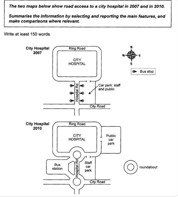 In 2010, a visitor could take basically the same pathway [描述了两个图之间的关系], despite the few major developments in front of the hospital building. A visitor, going north, would need to pass the roundabout to go on Hospital Road and see a bus station on the left as the replacement of the bus stops, and the car park on the right became only for the staff’s vehicles. Going down the road, there was another roundabout whose eastern exit, on Ring Road, led to the public car park on the east side of the hospital building. [写出“路线感”]